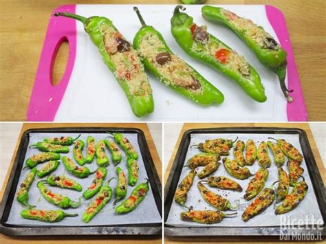 Fasi della preparazione dei friggitelli ripieni.