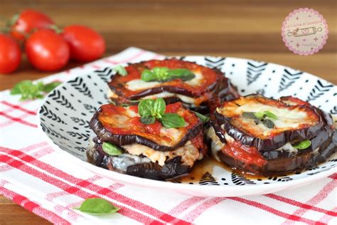- Oliate leggermente una teglia e componete le torrette di melanzane. mettete una melanzana più larga come base, farcite con un po' di sugo di pomodoro, mozzarella, basilico spezzettato a mano e parmigiano.