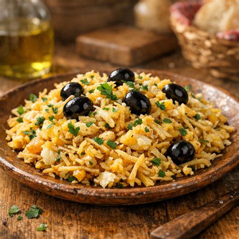 Questo famoso piatto può essere considerato come una reinterpretazione del classico della cucina inglese “Fish and Chips”. In questa ricetta il baccalà viene fatto soffriggere, ma precedentemente deve essere sfilacciato. Dovete realizzare il soffritto con patate tagliate a forma di fiammiferi, uova strapazzate e cipolle. Condite il tutto, alla fine, con prezzemolo, aglio e olive nere.