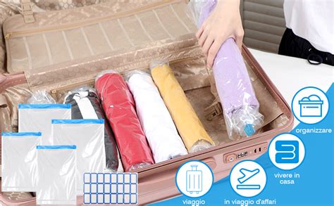 I sacchetti vengono forniti in confezione da 10 pezzi. Sacchetti per sottovuoto con esterno in nylon per essere impenetrabili all'aria, e interno in materiale per alimenti; un lato "ruvido" (goffrato o con impronta) per permettere una efficace estrazione dell'aria, lo spessore di 105 micron garantisce robustezza e tenuta contro le rotture accidentali; il sacchetto con impronta, con un ulteriore strato esterno in politene, risulta più resistente e impenetrabile all'umidità, per una migliore conservazione in congelatore. Tagliabili e saldabili per ottenere misure personalizzate. Utilizzabili in Frigorifero, Congelatore, Microonde e per riscaldare a bagnomaria.