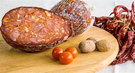 La proporzione tra i vari tagli e tra le rifilature deve essere tale da garantire le seguenti percentuali: 70% tagli magri (di cui almeno 80% prosciutto e lombo), 30% pancetta e grasso del prosciutto. È tassativamente vietato l’uso di carne congelata o comunque conservata. Speziatura a base di peperone trito dolce e piccante, semi di finocchi (e pepe). Il taglio delle carni prevede esclusivamente l’utilizzo del coltello ben affilato, onde evitare la smelmatura dei grassi. I pezzetti tagliati (cubetti di carne, anche irregolari) devono essere di misura non inferiore di 2 cm.