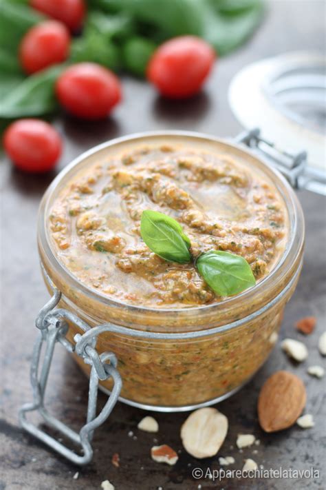 Questo pesto siciliano fresco, dal gusto intenso e saporito, viene preparato preferibilmente con i pomodori pizzutelli dal sapore deciso o con pomodori da salsa maturi, basilico, mandorle e tanto aglio. È il condimento più usato nella cucina trapanese e spesso viene preparato quando ci si riunisce in modo informale.