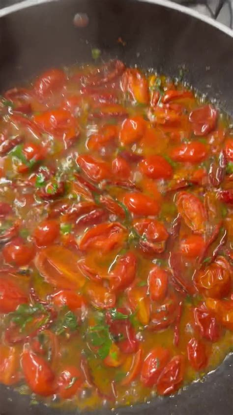 I pomodori sono dolci e polposi, io ho voluto cuocerli fino quasi a spappolarli completamente, facendone proprio un sugo di datterini freschi, ma dato il loro sapore speciale, potete condire la pasta con i datterini appena saltati in padella, o facendoli cuocere una decina di minuti.