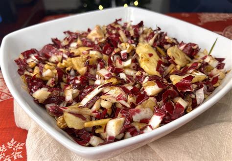 Un’altra variante prevede di tagliare ogni radicchio in due metà e poi ancora in due (in totale 4 pezzi). Togli la base più dura e poi taglialo a striscioline. Taglia a fettine sottili la mela e trita grossolanamente le noci. Metti poi tutto insieme e condisci con 2 o 3 prese di sale, olio e glassa di aceto balsamico.