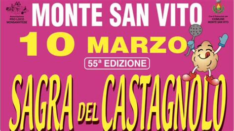Nel pittoresco borgo di Monte San Vito, immerso nelle morbide colline marchigiane, si rinnova ogni anno un appuntamento che unisce tradizione, gusto e divertimento: la Sagra del Castagnolo. Benvenuti a Monte San Vito, paese sorprendente per cultura, lavoro e bellezza. La manifestazione, nata ufficialmente nel 1965, ha preso forma unendo due tradizioni locali: le antiche celebrazioni quaresimali e i festeggiamenti del lunedì di Carnevale, arricchiti nel tempo da sfilate, giochi e musica. Oggi la sagra si snoda tra le vie del borgo e propone un programma ricco di eventi per tutte le età.