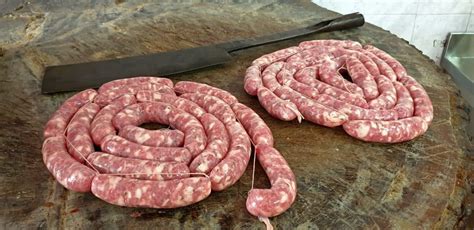 Una volta battuta e impastata, la carne viene insaccata in un budello rigorosamente naturale e legata con lo spago, formando corde di salsicce lunghe un paio di metri.