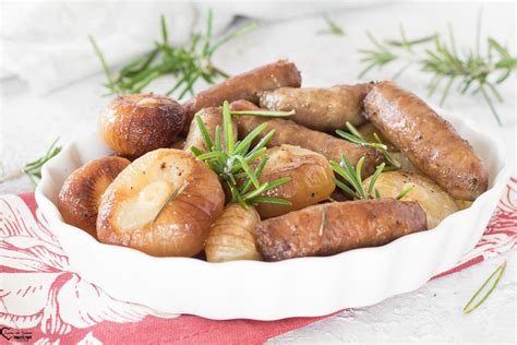 Ecco uno di quei piatti rustici salva-tempo che si cucina praticamente da solo!Metti le salsicce in una pirofila da forno con un filo di olio, sale, pepe, gli spicchi di aglio interi sbucciati e il rosmarino spezzettato a mano.