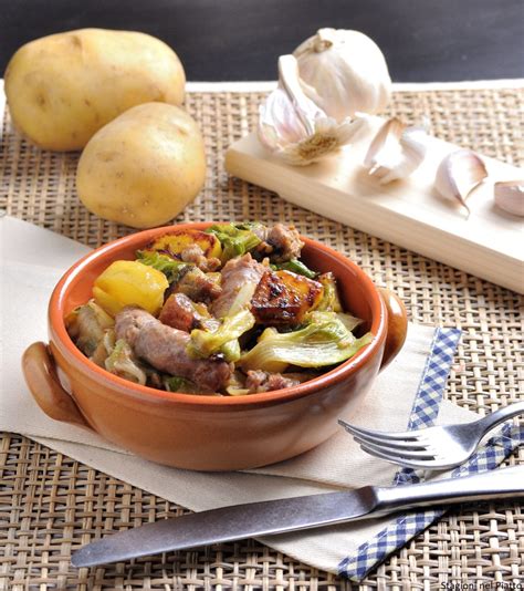 Questo piatto è una vera bomba, di quelli che si preparano la domenica a pranzo in gran quantità da condividere con amici e famiglia. La salsiccia deve essere buona. Ottima a dirla tutta. Andate dal vostro macellaio di fiducia e comprate un prodotto ben fatto, grasso ma non troppo (perché dai, alla fine sempre di salsiccia stiamo parlando…), saporito al punto giusto. Adesso aggiungete aglio a profumare, delle belle patate e un cespo di scarola freschissima.