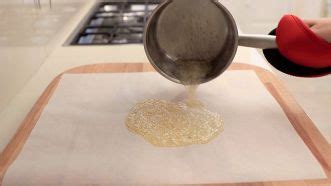 Quando avrai ottenuto uno sciroppo denso, trasparente, solo appena giallino e pieno di bolle, spegni il fuoco e versa subito lo sciroppo su un foglio di carta forno posizionato su di una superficie che non patisce il calore, come ad esempio un tagliere di legno.