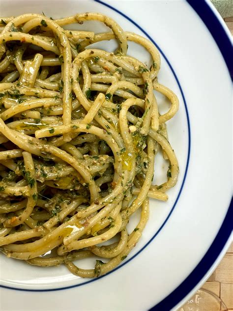 - Condire e servire: Scolatela al dente e conditela con il pesto preparato, aggiungendo, se vi piace, qualche pinolo intero prima di servire e, se necessario, qualche cucchiaio di acqua di cottura della pasta.