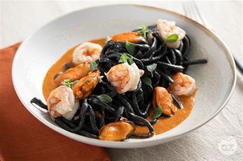 Un'alternativa interessante è preparare gli spaghetti alla chitarra al nero di seppia con gamberi e pomodorini. In questo caso: