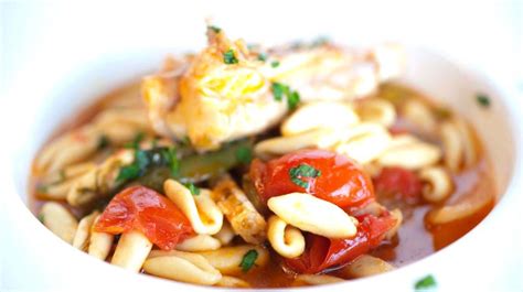 - Mettete la lisca, un paio di pomodorini ed il prezzemolo in acqua fredda e porre sul fuoco, in modo da preparare un fumetto di pesce. Lasciate cuocere coprendo per 5 minuti. Ultimate la cottura, aggiungendo il resto del fumetto e, se necessario, un po’ di acqua di cottura.