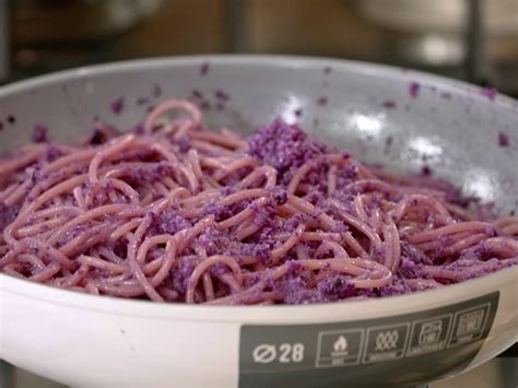 Gli spaghetti con cavolo cappuccio viola sono un primo velocissimo dal colore molto acceso. Responsabili di questo meraviglioso colore sono le antocianine, molecole che colorano di rosso, blu, viola e rosa la frutta come i mirtilli e l'uva, la verdura come la cipolla rossa di tropea, e i fiori. Il colore di questa pasta rimane invariato anche dopo la cottura.
