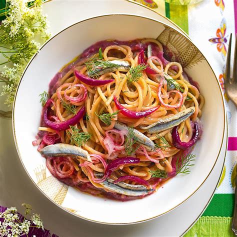 - Lessare gli spaghettoni in acqua bollente salata, ripassarli in padella con il sugo di cipolla, distribuire a nido nei piatti e aggiungere le Alici.
