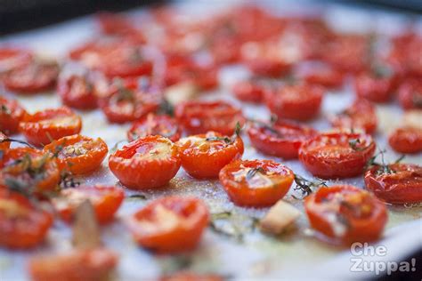 - Lava ed asciuga 250 grammi di pomodorini, tagliali nel senso della lunghezza e disponili su una leccarda foderata di carta forno.