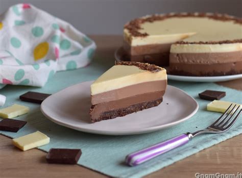 La torta ai tre cioccolati è un dolce super goloso, composto da tre diverse bavaresi, una al cioccolato bianco, una al cioccolato al latte e una al cioccolato fondente, con una base di biscotto al cacao (una sorta di pan di Spagna) senza glutine.