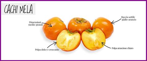 - Caco Mela: a differenza del caco vaniglia, il caco mela ha molto meno tannini, questo rende la polpa più soda e la sua maturazione avviene sull’albero, rendendolo commestibile non appena raccolto.