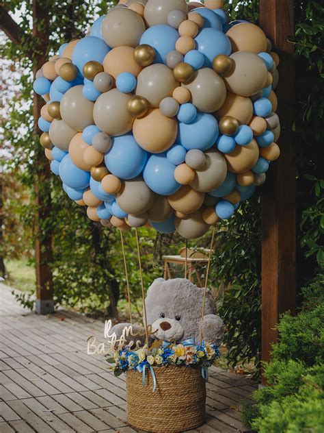 Questa mongolfiera è facile da realizzare. Un cestino come base e dei palloncini di varie dimensioni ad elio. Nastrini e marshmellow per decorare.