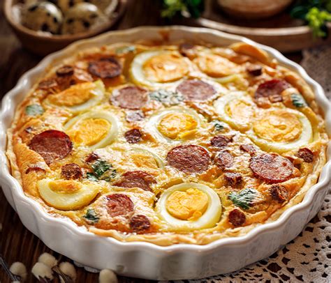Stendete la pasta sfoglia su una tortiera, bucherellandone il fondo con i rebbi di una forchetta. A questo punto, versate nella pasta il composto ottenuto con le uova sbattute assieme al Grana. Livellate bene con il dorso del cucchiaio e adagiate sulla superficie le fettine di Salsiccia e le uova sode fatte a metà o a spicchi.