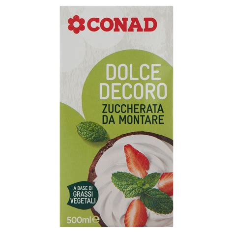 Dolce Decoro Conad è una crema a base di grassi vegetali zuccherata, ideale per decorare torte con panna montata. È un prodotto dolciario già dolcificato, pronto per essere montato con le fruste elettriche fino a raggiungere la consistenza desiderata.