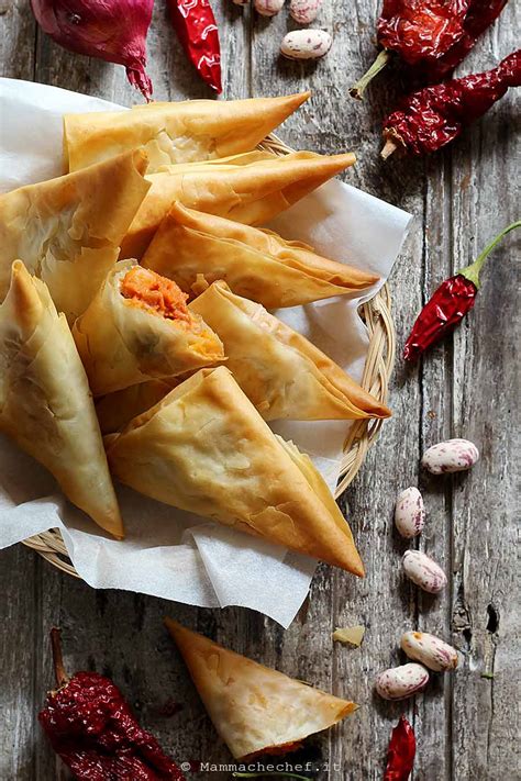 I triangolini piccanti di pasta fillo sono un'idea deliziosa e veloce per un finger food ricco di sapore. Questi fagottini croccanti sono farciti con un ripieno cremoso di fagioli e peperoni cruschi, una specialità della cucina calabro-lucana. I peperoni cruschi sono peperoni rossi dalla forma allungata, essiccati e resi croccanti, utilizzati per insaporire molte ricette tipiche.