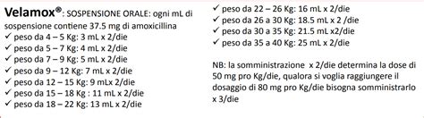 Ogni ml di Velamox sospensione contiene 37,5 mg di amoxicillina. La tabella seguente riporta il volume di sospensione (in ml) corrispondente alle dosi giornaliere minima e massima e alla dose speciale di 50 mg/kg/die.